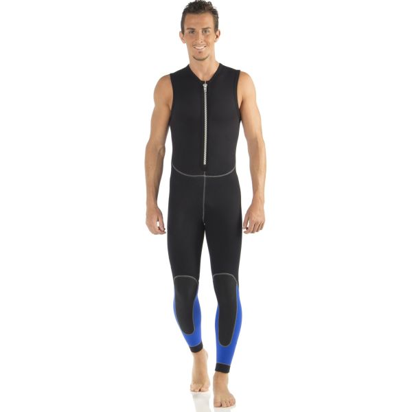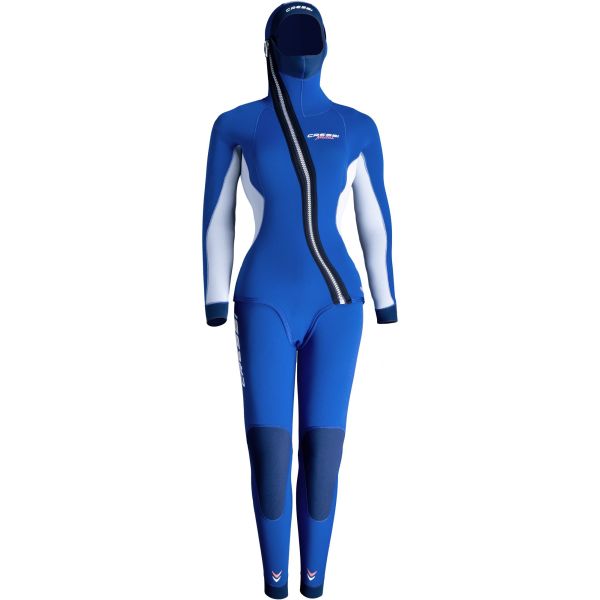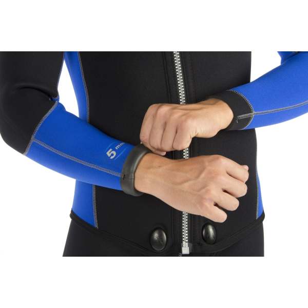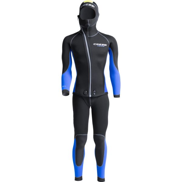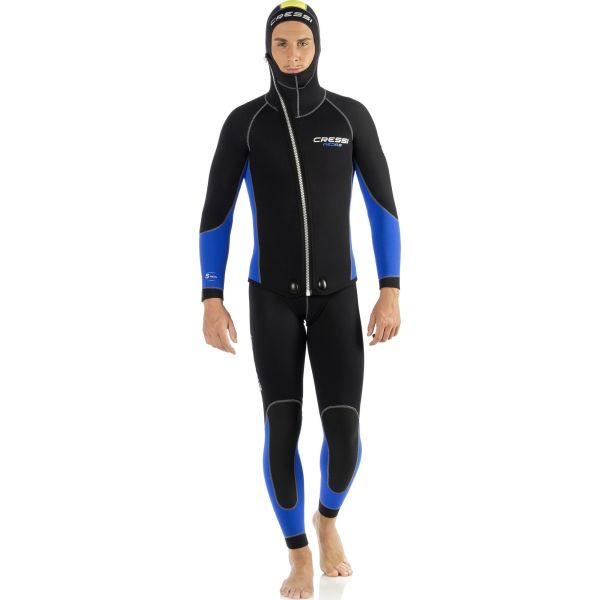The Cressi Medas 5mm is a two-piece wetsuit for water temperatures between 16°C and 24°C. A classic 5 mm + 5 mm combination, the suit consists of a ziped jacket with an integrated hood, paired with full-torso dungaree-style trousers featuring a front-zip. This combination of layers is very watertight and offers outstanding thermal insulation around the core of the body.