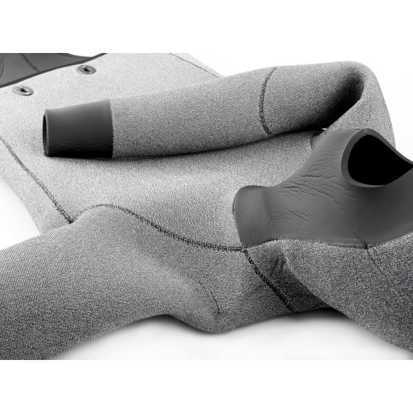 Available in 8 mm (water temperatures between 7°C and 12°C) and 5 mm (water temperatures between 16°C and 24°C) versions, the suit consists of a one-piece jacket with an integrated hood and button fastening at the crotch, paired with full-torso dungaree-style trousers. This layered combination is highly watertight, delivering exceptional thermal insulation around the core of the body.