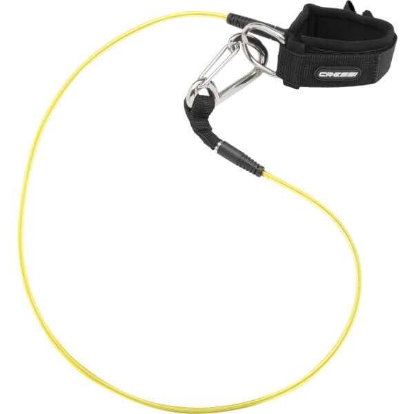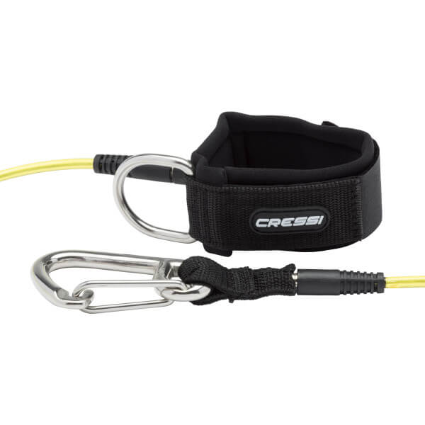 The Cressi Safety Lanyard is designed to be used as a guide while line diving. Safety lanyards are required to be worn during freediving classes. The Cressi’s Safety Lanyard carabiner is stainless steel. The D-ring is made with durable steel. The flexible and strong cable is surrounded by a transparent spine to protect the cable from abrasion. Our comfortable Neoprene strap can be worn on the wrist or ankle. The Neoprene cuff includes a quick release tab to release the cuff.