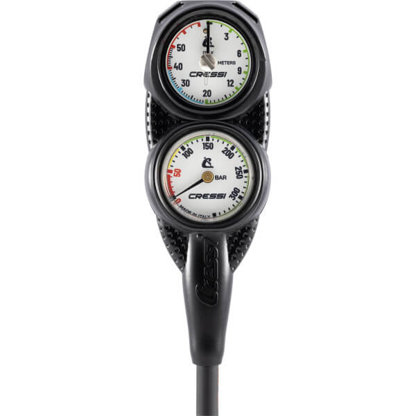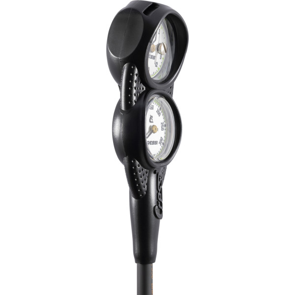 Compact and built to last, this two-gauge console combines a Mini SPG and depth gauge. The textured boot is easy to handle, even while wearing gloves, and can be rigged with a clip or bungee and secured to the diver’s BC for a streamlined profile in the water.